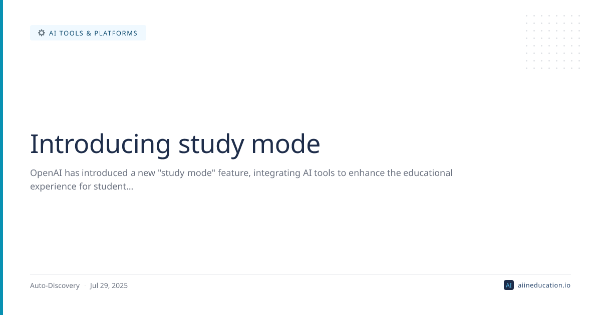 OpenAI has introduced a new "study mode" feature, integrating AI tools to enhance the educational experience for students. This mode leverages AI to provide personalized learning assistance, explain complex concepts, and support various study activities, aiming to make learning more interactive and effective.